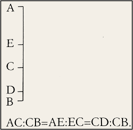 “Ora, prendiamo una linea e dividiamola in due parti tra loro disuguali e, nella stessa proporzione, dividiamo i due segmenti ottenuti allo stesso modo della linea originale. Otterremo in tal modo quattro segmenti: AE EC CD DB”.